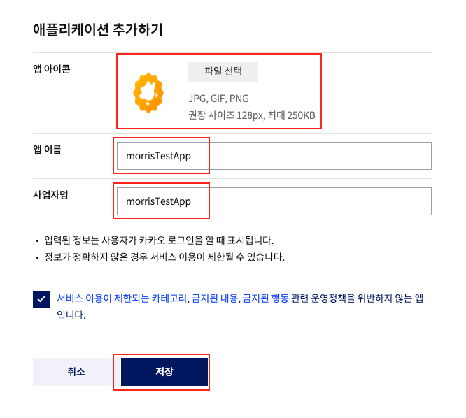 앱 정보를 입력하고 저장을 누르면 돼요.