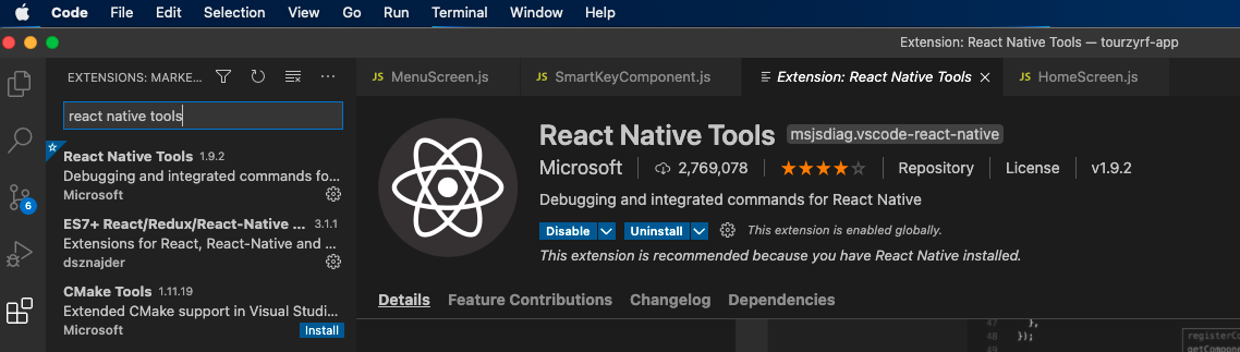 Extension for Visual Studio Code - Debugging and integrated commands for React Native